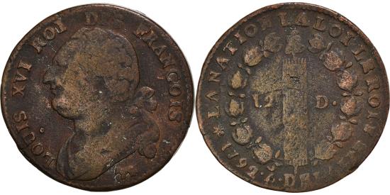 | | Coin, France, Louis XVI, 12 deniers françois, 12 Deniers, 1792, Pau, | | | 12 deniers françois, Bust of Louis XVI left, Liberty cap above column dividing value, wreath surrounds, Mint mark: Cow. | | FEATURES |