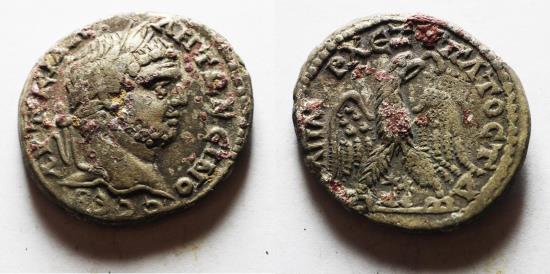 Phoenicia. Ake-Ptolemais under Caracalla (AD 198-217). Billon tetradrachm (28mm, 14.25g). Struck AD 215-217. Laureate bust of Caracalla r. / Eagle with spread wings standing facing, head r. with wreath in beak; between legs, caps of the Dioscuri. Prieur 1224.