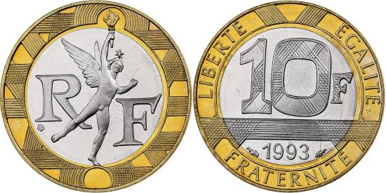 | | France, 10 Francs, Génie, 1993, Paris, Proof, Bi-Metallic, | | | Winged genie of Liberty holding a torch in his right hand., Denomination and date., Fingerprints. | | FEATURES |