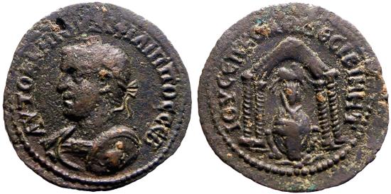 Philip I AE25 Nisibis, Mesopotamia. Tyche in tetrastyle temple. AΥTOK K M IOΥΛI ΦIΛIΠΠOC CEB, Radiate and cuirassed bust of Philip left / IOΛ CEΠ KOΛΩ NECIBI MHT, Tyche seated facing in tetrastyle temple; ram above Tyche, River-god swimming right below. SNG Copenhagen 240. 244-249 AD. 9.10g. |
