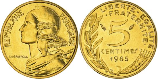 | | Coin, France, Marianne, 5 Centimes, 1985, Paris, , Aluminum-Bronze | | | Marianne, Liberty bust left, Denomination above date, grain sprig below, laurel branch at left, 1991-1993 dated coins, non-Proof exist in both coin and medal alignment., Henri Lagriffoul | | FEATURES |
