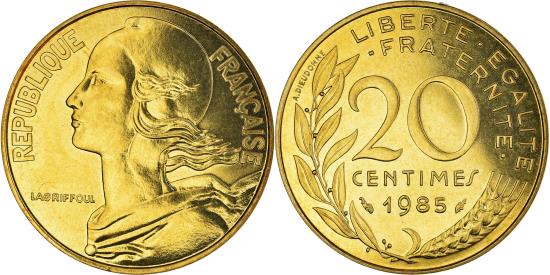 | | Coin, France, Marianne, 20 Centimes, 1985, Paris, , Aluminum-Bronze | | | Marianne, Liberty bust left, Denomination above date, grain sprig below, laurel branch at left, Without mint mark. 1991-1993 dated coins, non-Proof, exist in both coin and medal alignment., Henri Lagriffoul | | FEATURES |