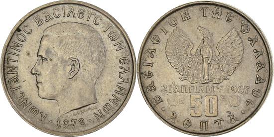 | | Coin, Greece, Constantine II, 50 Lepta, 1973, , Copper-nickel, KM:97.1 | | | Small head left, Soldier in front of Phoenix | | FEATURES |