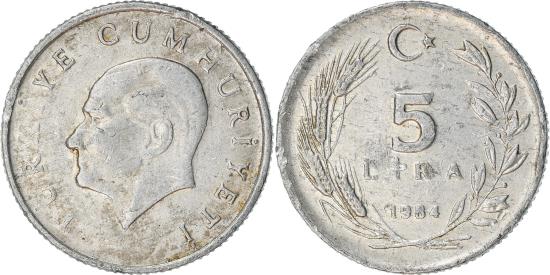 | | Coin, Turkey, 5 Lira, 1984, , Aluminum, KM:963 | | | Head left, Value and date within wreath, Varieties exist. | | FEATURES |