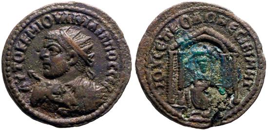 Philip I AE25 Mesopotamia, Nisibis. Tyche of Nisibis in temple Obv: Radiate and cuirassed bust left, seen from the back, holding spear and decorated shield. AYTOK M IOVΛI ΦIΛIΠΠOC CEB. Rev: Tyche of Nisibis seated facing within tetrastyle temple; above, her, ram leaping right; below, river-god swimming to right. IOY CEΠ KOΛΩ NЄCIBI MHT.