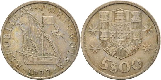 | | Coin, Portugal, 5 Escudos, 1977, , Copper-nickel, KM:591 | | | Ship, Shield flanked by stars, date below, REPUBLICA PORTUGUESA | | FEATURES |