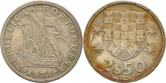 | | Coin, Portugal, 2-1/2 Escudos, 1971, , Copper-nickel, KM:590 | | | Ship, Shield flanked by stars, value below, Martins Barata | | FEATURES |
