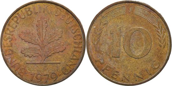 | | Coin, GERMANY - FEDERAL REPUBLIC, 10 Pfennig, 1979, Hambourg, , Brass | | | Five oak leaves, date below, Denomination, BUNDESREPUBLIK DEUTSCHLAND | | FEATURES |