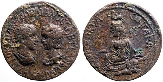 Gordian III & Tranquillina AE31 Singara, Mesopotamia. Tyche Obv: Confronted busts of Gordian on l., laureate, draped and cuirassed, and Tranquillina on r., draped and wearing stephane. Rev: Tyche seated l. on rock, holding branch; the centaur Sagittarius above to l., discharging arrow, river god swimming l. below. SNG Cop. 256. AD 238-244. 23.13g. |