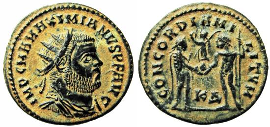 MAXIMIANUS. 286-305 AD. Æ Double Radiate Fraction (3.91gm, 12h). Cyzicus mint. Struck circa 298-299 AD. Radiate, draped, and cuirassed bust right, seen from behind / Maximianus standing right, holding sceptre, receiving Victory on globe from Jupiter standing left, holding sceptre; K ∆ //•. RIC VI 13; Cohen 50. Good VF, desert patina. Extremely rare |