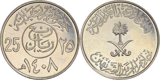 | | Coin, Saudi Arabia, UNITED KINGDOMS, Fahad Bin Abd Al-Aziz, 25 Halala, 1/4 | | | National emblem at center, legend above and below, Legend above inscription in circle dividing value, date below | | FEATURES |