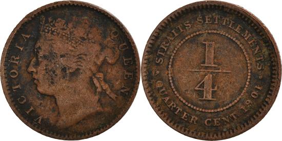 | | Coin, Straits Settlements, Victoria, 1/4 Cent, 1901, , Bronze, KM:14 | | | Crowned head left, Value within beaded circle, VICTORIA QUEEN G.W. DeSaulles | | FEATURES |