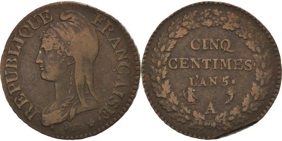 | | Coin, France, Dupré, 5 Centimes, AN 5, Paris, , Bronze, KM:640.1 | | | Dupré, Liberty head left, Value within oak wreath, REPUBLIQUE FRANCAISE <Bullet> * | | FEATURES |