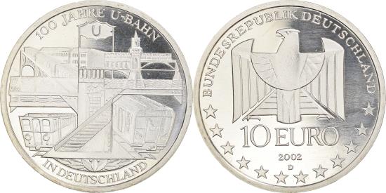 | | Coin, GERMANY - FEDERAL REPUBLIC, 10 Euro, 2002, Munich, Germany, BE, | | | Stylized squarish eagle, Elevated and subterranean train views | | FEATURES |