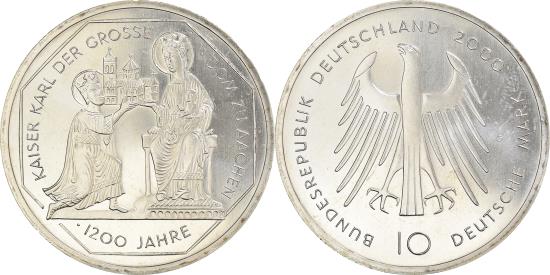| | Coin, GERMANY - FEDERAL REPUBLIC, 10 Mark, 2000, Karlsruhe, BE, | | | Stylized eagle, Charlemagne handing church model to Madonna and child | | FEATURES |