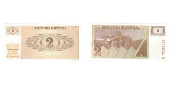 | | Banknote, Slovenia, 2 (Tolarjev), KM:2a, AU(55-58) | | | Issued note., Pedimented beehive at lower left, denomination numeral in guilloche over a representation of the dance of the Catrniolan bee on an underprint of honeycomb at center right., Mountain ridge of Triglav at left center., Brown on tan and ochre underprint. | | FEATURES |