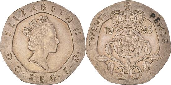 | | Coin, Great Britain, Elizabeth II, 20 Pence, 1995, , Copper-nickel | | | Crowned head right, Crowned rose, Raphael Maklouf | | FEATURES |