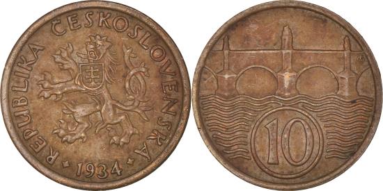| | Coin, Czechoslovakia, 10 Haleru, 1934, , Bronze, KM:3 | | | Czech lion with Slovak shield, date below, Charles Bridge of Praha, denomination below | | FEATURES |