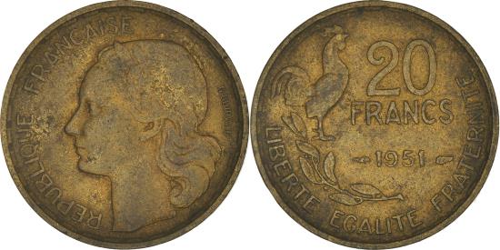 | | Coin, France, Guiraud, 20 Francs, 1951, Paris, , Aluminum-Bronze | | | Guiraud, Head left, G. GUIRAUD behind head, Denomination above date at right, rooster above laurel branch at left, Without mint mark. | | FEATURES |