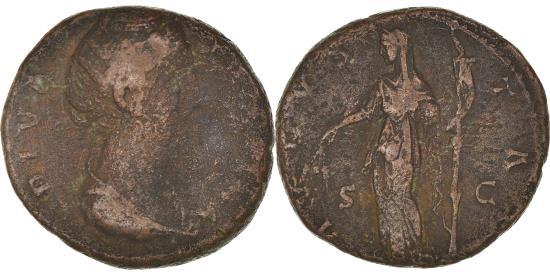 | | Coin, Diva Faustina I, As, After 141 AD, Rome, , Bronze, RIC:1169 | | | veiled, and draped bust of Faustina I, right, Ceres, veiled, draped, standing left, holding two corn-ears downwards in right hand, and long torch, vertical, in left | | FEATURES |