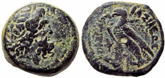 PTOLEMAIC KINGS OF EGYPT. Ptolemy VI Philometor (First sole reign, 180-170 BC). Ae Obol ( 12.11. 26 mm). Cyprus. Head of Zeus-Ammon right, wearing tainia. ΠΤΟΛΕΜΑΙΟΥ ΒΑΣΙΛΕΩΣ. Eagle with closed wings standing left on thunderbolt; lotus flower to left, EYΛ between legs; . Svoronos 1398 (Ptolemy VI with Eulaios); SNG Copenhagen 294; Weiser 152 (Ptolemy VI with Eulaios). gVF, pleasant natural red earthen patina.