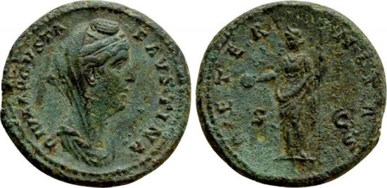 Obv: DIVA AVGVSTA FAVSTINA. Veiled and draped bust right. Rev: AETERNITAS / S - C. Providentia standing left, holding globus and sceptre.