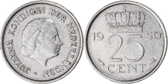 | | Coin, Netherlands, Juliana, 25 Cents, 1950, , Nickel, KM:183 | | | Head right, Crowned value divides date | | FEATURES |