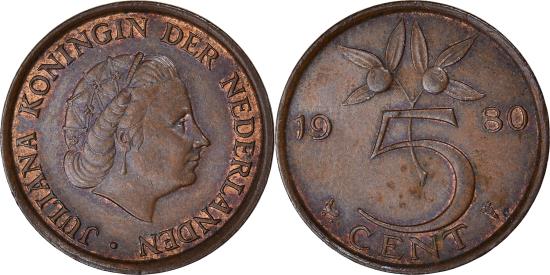 | | Coin, Netherlands, Juliana, 5 Cents, 1980, , Bronze, KM:181 | | | Head right, Value divides date and orange branch | | FEATURES |