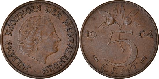 | | Coin, Netherlands, Juliana, 5 Cents, 1964, , Bronze, KM:181 | | | Head right, Value divides date and orange branch | | FEATURES |