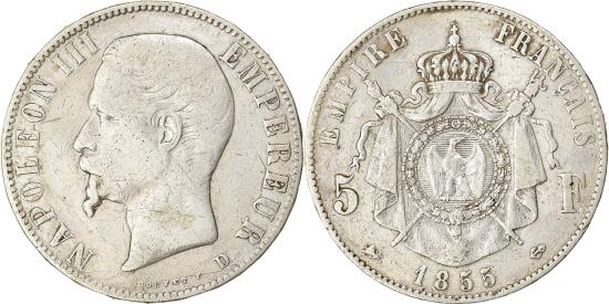| | Coin, France, Napoleon III, 5 Francs, 1855, Lyon, , Silver, KM:782.3 | | | Napoléon III, Head left, Crowned and mantled arms divide denomination | | FEATURES |