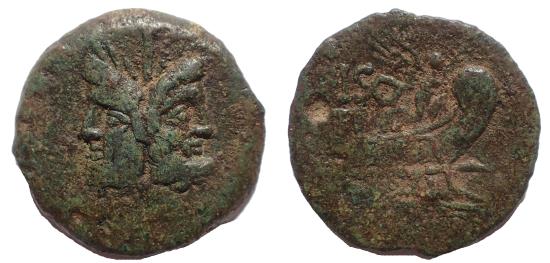 L. Calpurnius Piso Frugi. 90 BC. Æ As 25mm, 8.3 gm. Rome mint. Obv: Laureate head of bearded Janus; I (mark of value) above Rev: Prow of galley right, on which stands Victory right, holding palm frond. Crawford 340/4; Sydenham 677.