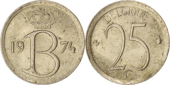 | | Coin, Belgium, 25 Centimes, 1974, Brussels, , Copper-nickel, KM:153.1 | | | Large denomination between mint marks, legend in French, Crowned B divides date, Mint mark - Angel Head. Mintmaster Vogeleer's privy mark - Bird., BELGIQUE | | FEATURES |
