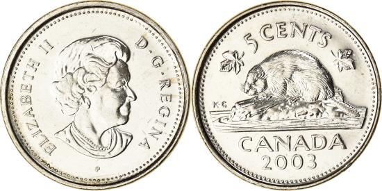| | Coin, Canada, Elizabeth II, 5 Cents, 2003, Royal Canadian Mint, | | | Crowned head right, Beaver on rock divides dates and denomination, Dora dePedery-Hunt | | FEATURES |