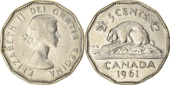 | | Coin, Canada, Elizabeth II, 5 Cents, 1961, Royal Canadian Mint, Ottawa | | | Laureate queen's bust right, Beaver on rock divides date and denomination, Mary Gillick | | FEATURES |