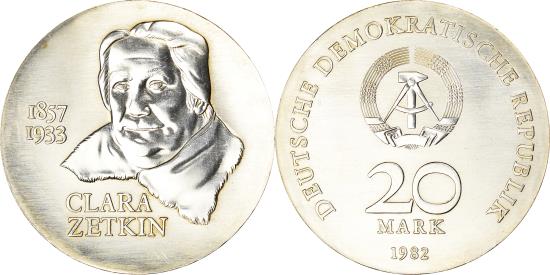 | | Coin, GERMAN-DEMOCRATIC REPUBLIC, 125th Anniversary - Birth of Clara Zetkin | | | State emblem, denomination, Bust 3/4 left, dates at left | | FEATURES |