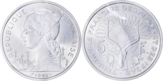 | | Coin, FRENCH AFARS & ISSAS, 5 Francs, 1968, Paris, ESSAI, , Aluminium | | | KM14. | | FEATURES |