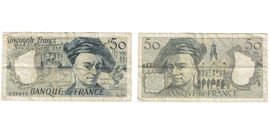 | | France, 50 Francs, Quentin de La Tour, 1989, O.56, F(12-15), Fayette:67.15 | | | Signature D. Ferman, B. Dentaud and A. Charriau. 1988; 1989., Maurice Quentin de la Tour at center right, and Palace of Versailles at left center in background., Quentin de la Tour and St.Quentin City Hall at center right in background., Deep blue-black on multicolor underprint. | | FEATURES |