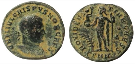 | Crispus. Caesar, 316-326 AD. Æ Follis (19 mm, 3.3 g). Struck 317-320 AD. D N FL IVL CRISPVS NOB CAES, Laureate, draped, and cuirassed bust right. / PROVIDEN-TIAE CAESS, Jupiter standing left, holding Victory on globe in right hand, scepter in left; palm / A // SMN . (mint of Nicomedia). RIC VII, pg 604, #32.R2 |