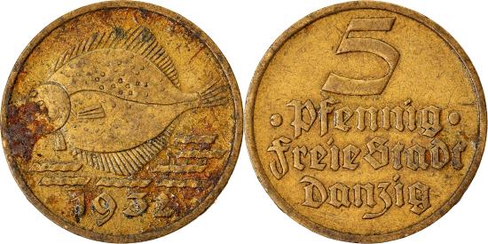 | | Coin, DANZIG, 5 Pfennig, 1932, , Aluminum-Bronze, KM:151 | | | Denomination, Turbot left, date below | | FEATURES |