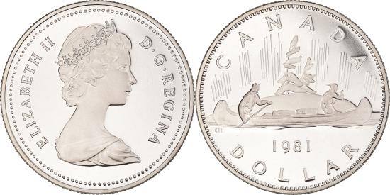 | | Coin, Canada, Elizabeth II, Dollar, 1981, Royal Canadian Mint, Ottawa, Proof | | | Young bust right, Voyageur, date and denomination below, Modified design., Arnold Machin | | FEATURES |