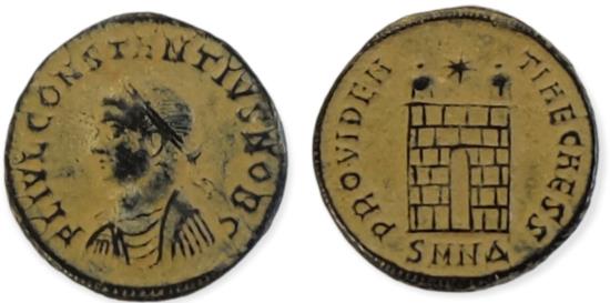 Constantius II, AE Follis. Nicomedia. 324-325 AD. FL IVL CONSTANTIVS NOB C, laureate, draped, cuirassed bust left. PROVIDEN-TIAE CAESS, campgate, 6 layers, two turrets, star above. Mintmark: SMN delta.3.2 g - 18 mm RIC VII Nicomedia 94, rated R1.Extremely fine