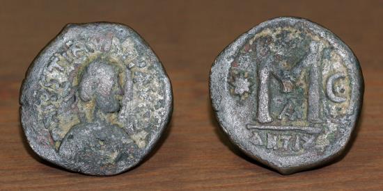 Justin I (522-527 AD) AE Byzantine Follis Large M, Crescent Antix, Antioch Mint OBV: "DN IVSTINVS PP AVG"; Pearl-diademed, draped, and cuirassed bust right. REV: Large "M"; star to left, crescent to right; "ANTIX" in exergue, "A" below "M". Weight: 13.96gm Size: 34mm Very Fine & Good Very Fine.