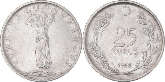 | | Coin, Turkey, 25 Kurus, 1966, , Stainless Steel, KM:892.3 | | | Standing figure facing, Value within wreath, Reduced weight | | FEATURES |