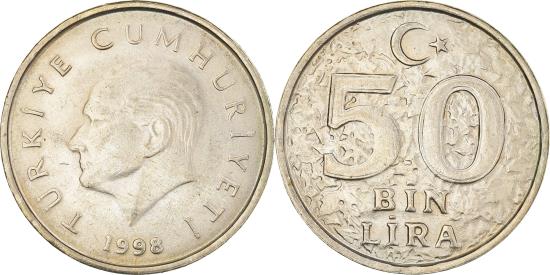 | | Coin, Turkey, 50000 Lira, 50 Bin Lira, 1998, , Copper-Nickel-Zinc | | | Head of Atat, Value | | FEATURES |