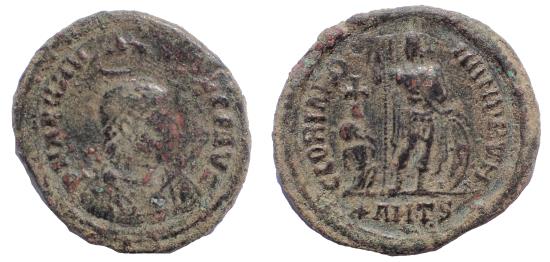 Arcadius. AD 383-408. Æ 25 mm. 5.5 gm. Antioch mint. Obv: Rosette-diademed, draped, and cuirassed bust right, holding spear and shield; above, manus Dei crowning him with wreath Rev: Emperor standing facing, head left, holding labarum and shield; to left, bound captive seated left, cross above; *ANTς. RIC IX 41b.
