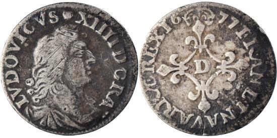 | Coin, France, Louis XIV, 4 Sols des Traitants, 1677, Vimy-en-Lyonnais, Rare |