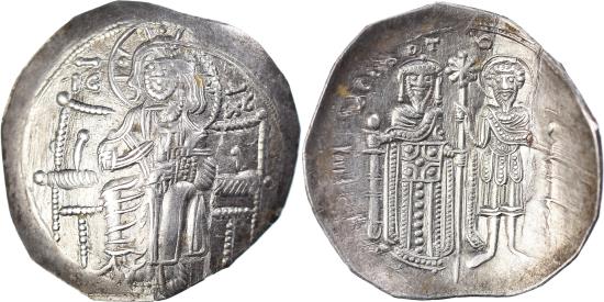 | | Theodore I Lascaris, Trachy, 1208-1222, Magnesia, Silver, , Sear:2064 | | | Christ Pantokrator facing, enthroned on a seat with a backrest, wearing pallium and colombium, making the gesture of teaching/blessing with his right hand, and holding the New Testament in his left hand., Theodore I Lascaris (right), wearing a pearled crown with pendilia, wearing the loros, and Saint Theodore (Theodore Tiron or Theodore the Stratilate) (left), nimbed, dressed as a Roman soldier, wearing sagum, standing facing, each holding between them a long vertical sceptre surmounted by a star, and holding in their other hand a sword by the pommel., IC - XC, ΘЄOΔωPOC ΔЄCΠOT O ΘЄOΔωPOC | | FEATURES |