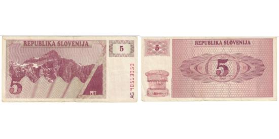 | | Banknote, Slovenia, 5 (Tolarjev), 1990, KM:3a, VF(30-35) | | |