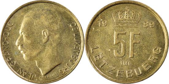 | | Coin, Luxembourg, Jean, 5 Francs, 1989, , Aluminum-Bronze, KM:65 | | | Head left, Crown divides date above value | | FEATURES |