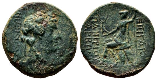 Obverse: NIKAIΕΩN. Head of Dionysos to right, wearing taenia and wreath of ivy and fruit; to right, monogram; Reverse: EΠI ΓAIOY / ΠAΠIPIOY / KAPBΩNOΣ / ΡΩΜΗ/ Roma seated left on pile of shields, holding Nike in her right hand and spear in her left; Very nice exemplar of this uncommon and interesting issue, in VF+/EF condition, conserving complete details in both sides, bold reliefs and a pretty green patina. HGC 7, 590. Nicea mint, 62-59 BC. 8,35 g - 24 mm -------------------------------------------------------------------------------------------------- Visit our site about Numismatics and Archaeology: aeternitas-numismatics.com |